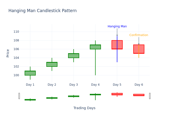 اینجا نمودار تصویری الگوی Hanging Man در یک روند صعودی همراه با کندل تأیید را مشاهده میکنید: